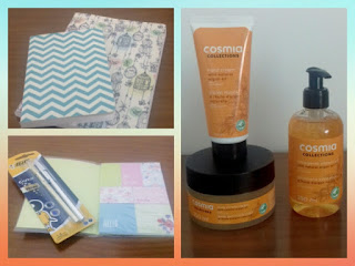 Bem, mas vamos lá ao que realmente a maior parte de vocês lhes interessa que é o sorteio. Os objectivos que estão em sorteio são: um gel exfoliate para o corpo, um gel de duche, uma loção de corpo, um creme de mãos, dois cadernos, um conjunto de bloco de notas aderente e duas canetas, uma preta e outra azul (as fotos dos produtos estão ao logo do texto). O valor dos produtos do sorteio roda os 15€.